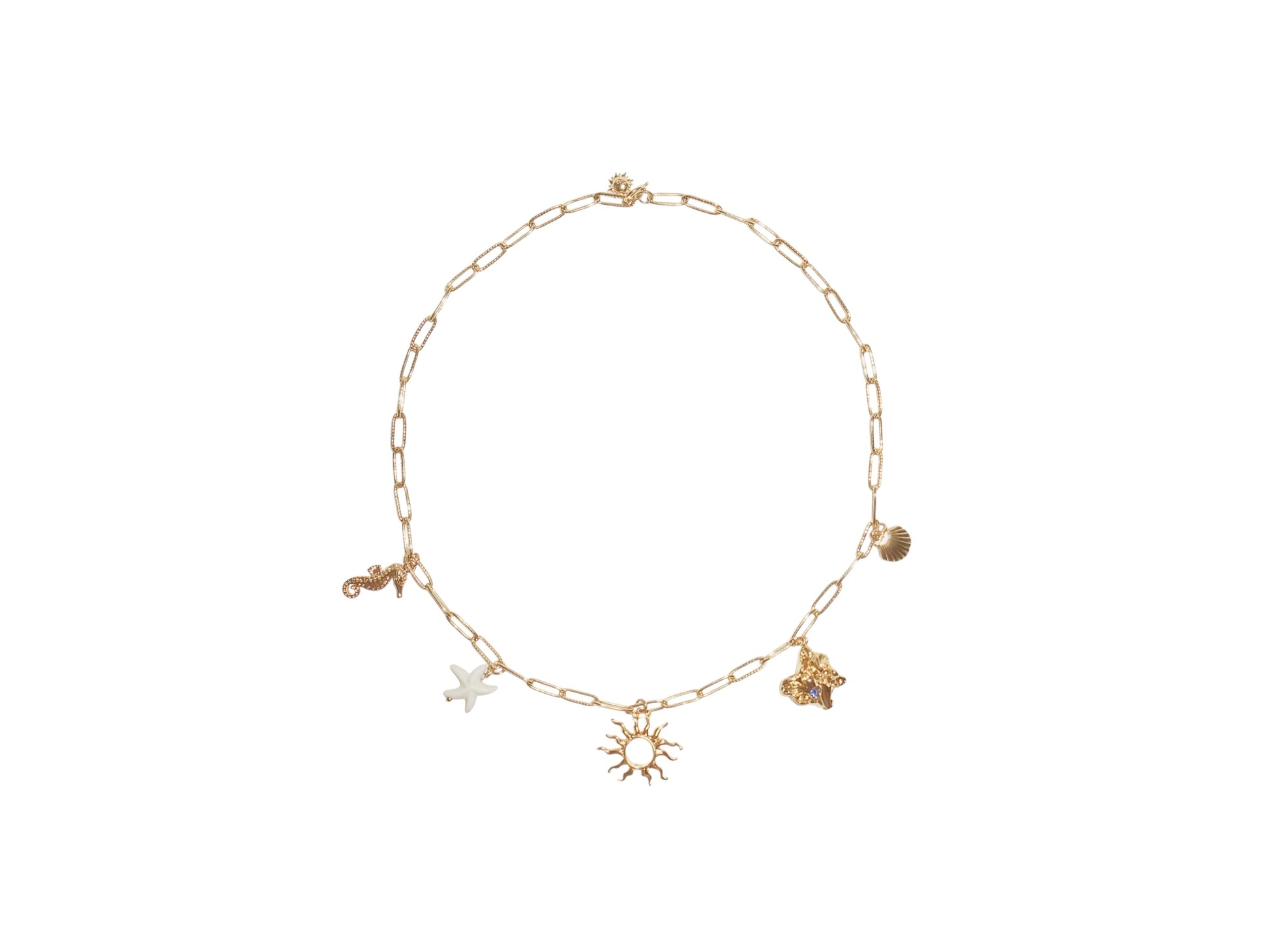 A sparkling gold chain is beautifully adorned with adorable ocean-inspired charms, adding a fresh, playful touch to any outfit. It brings to mind the feeling of strolling along a sun-soaked beach, surrounded by warmth and freedom.
