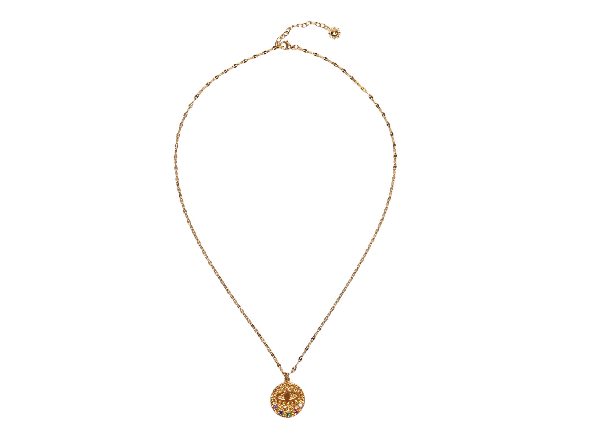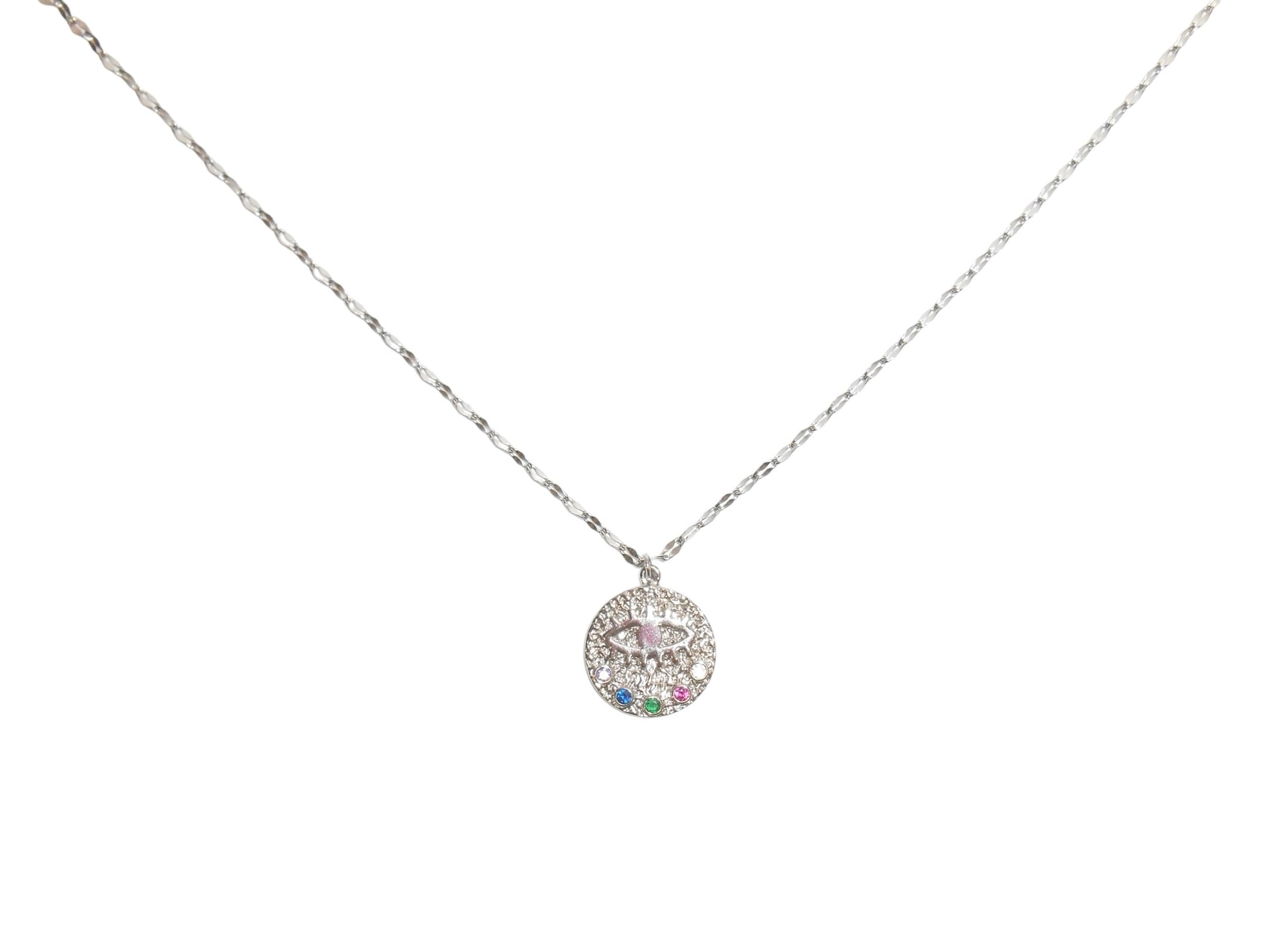 A mystical eye motif engraved on brilliant gold, adorned with harmoniously set colorful gemstones. This necklace serves as a symbol of luck and intuition, protecting you from negative energy.