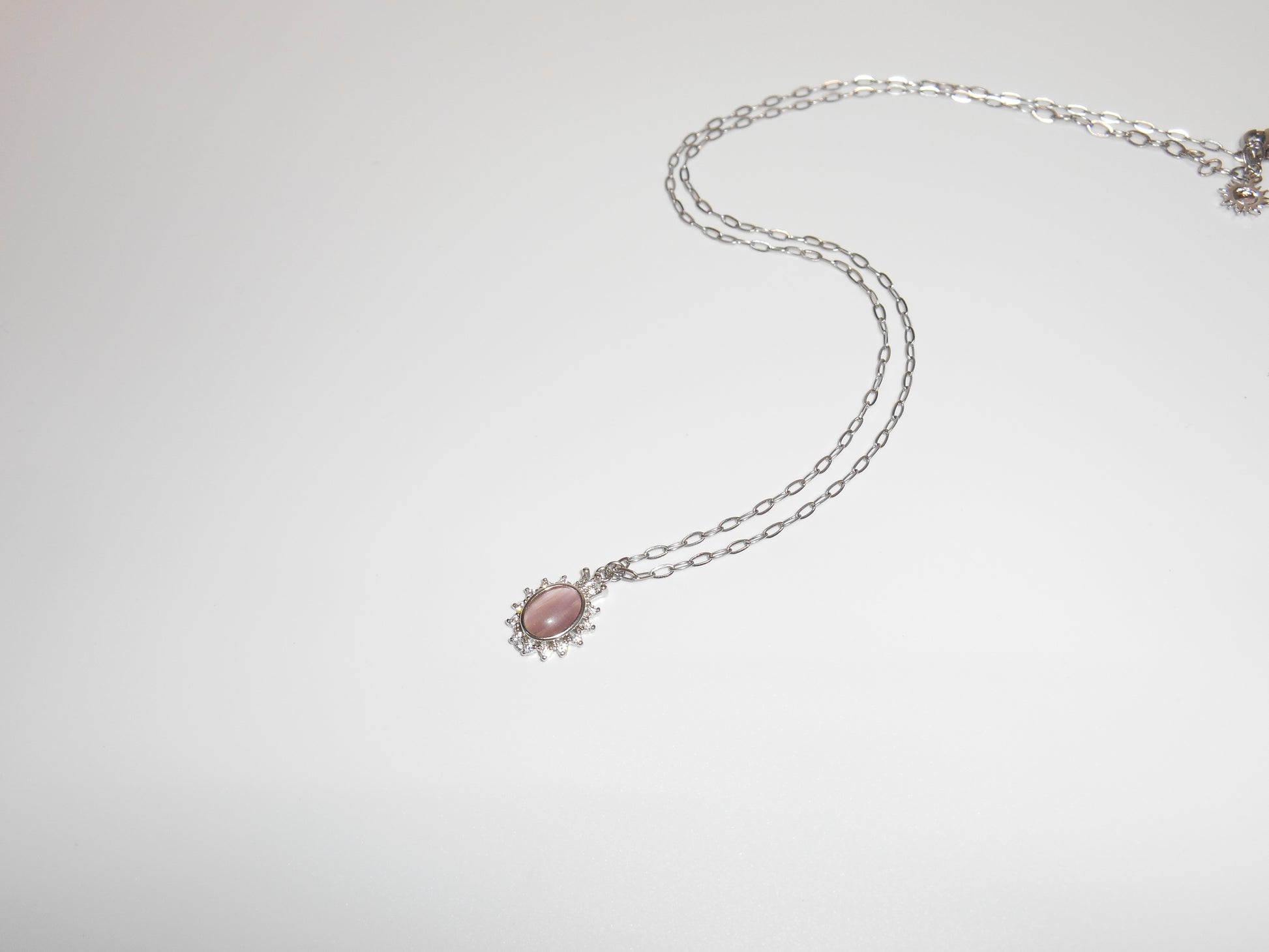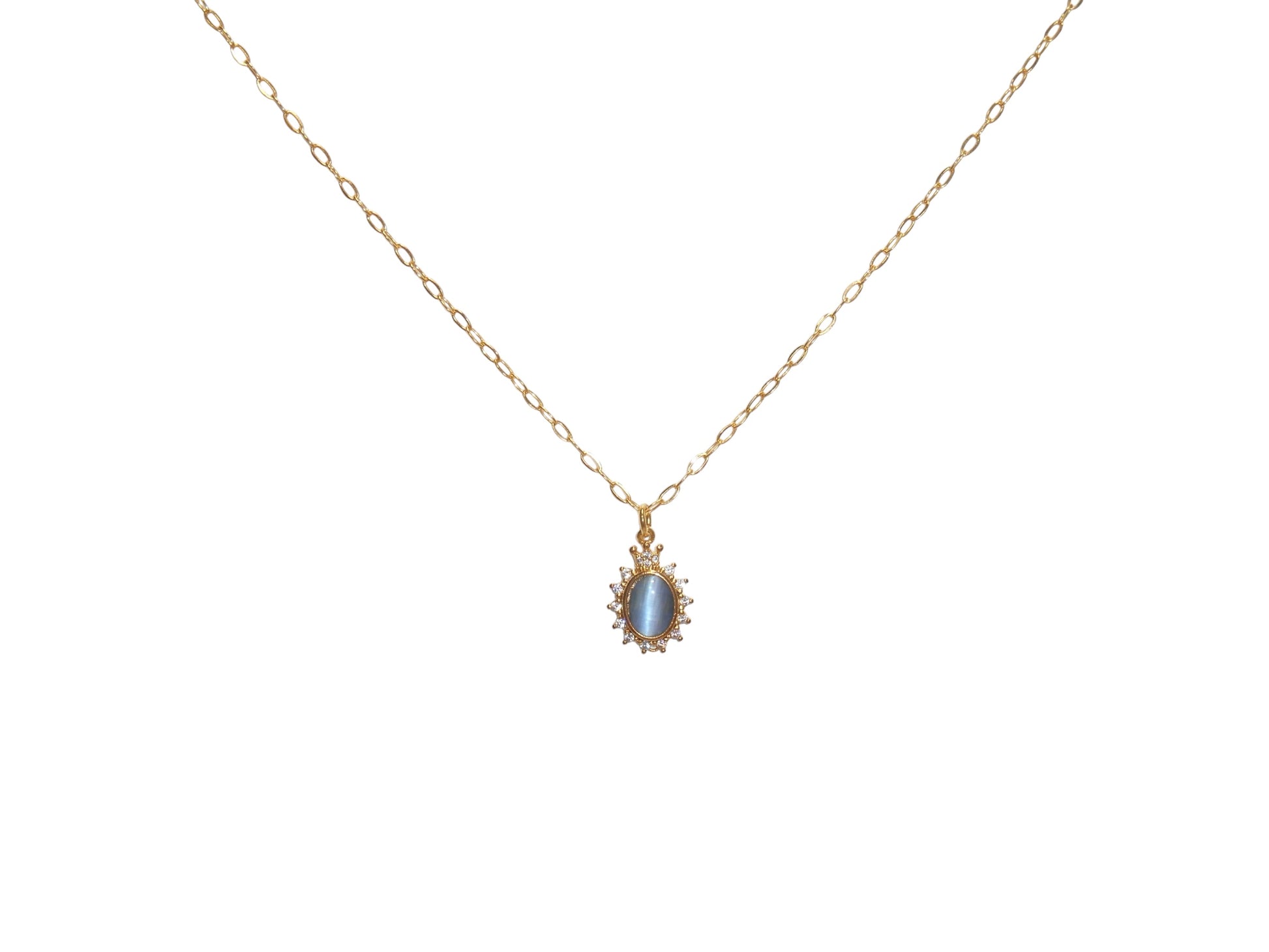 A stone that seems to hold clear light, enhanced with a gold frame and crystal details that spread like moonlight — the ‘Moon Stone Necklace’.