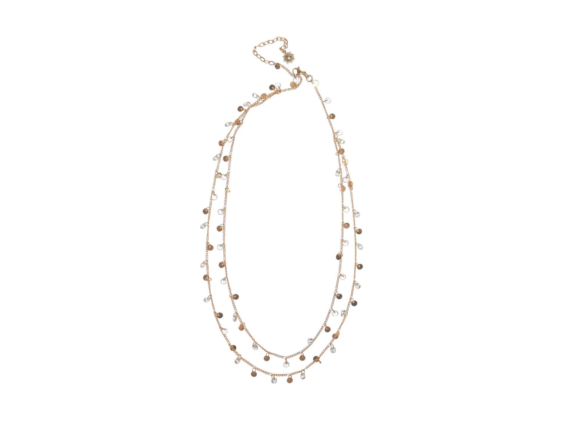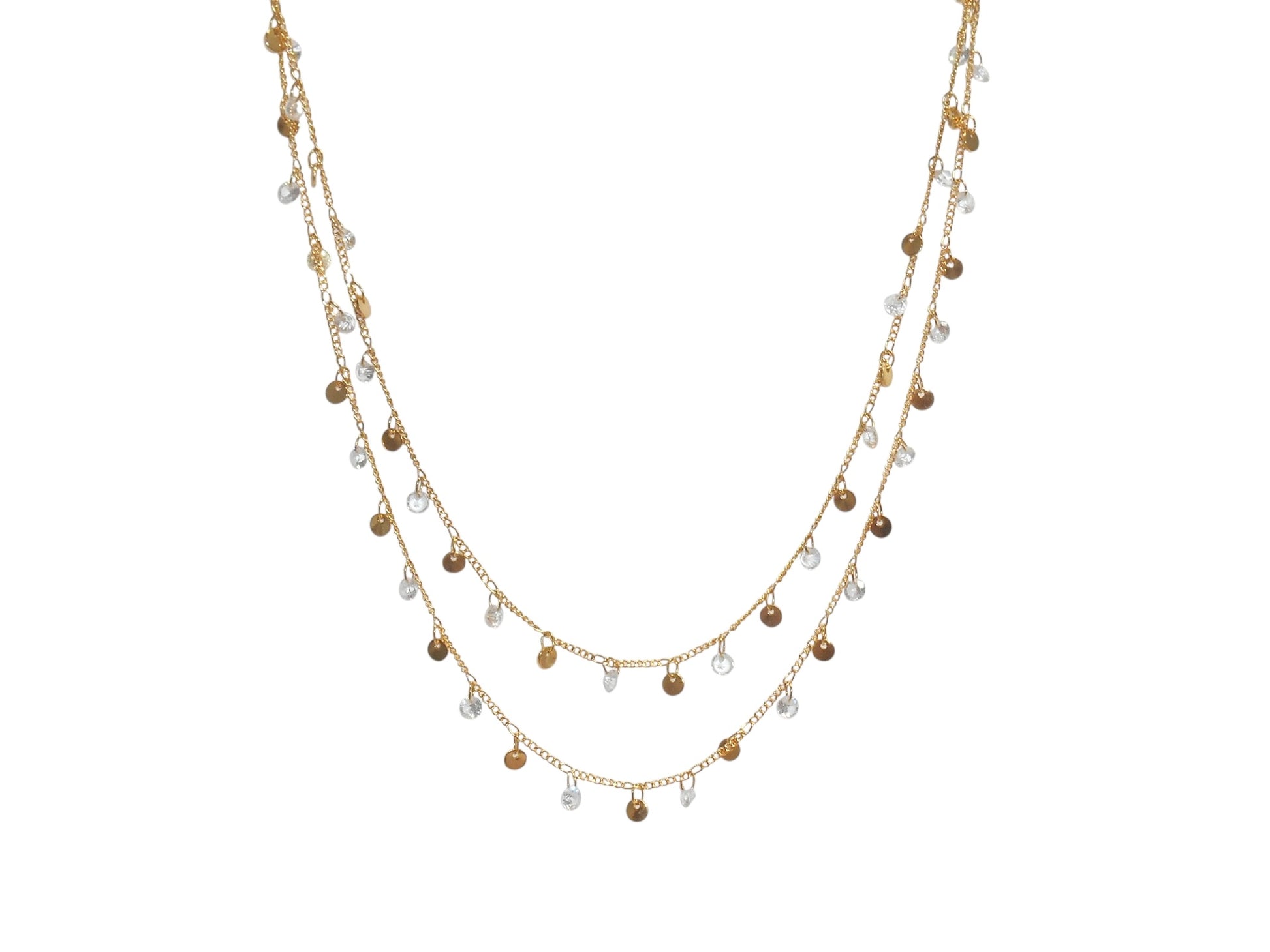 Sparkling gold/silver discs and clear charms layered in two delicate strands create a light, refreshing mood. The subtle light flowing along your neckline makes any summer look even more special.